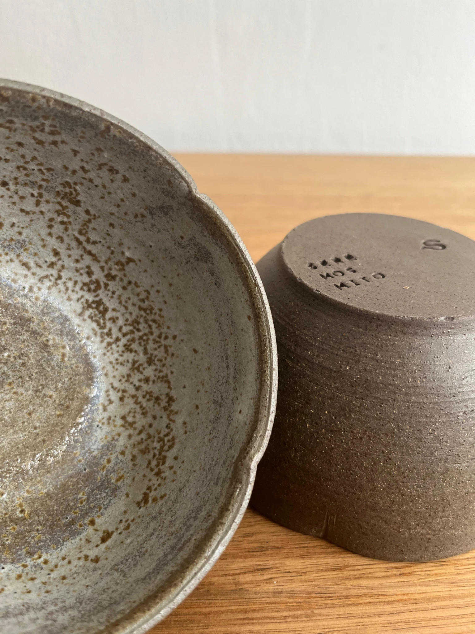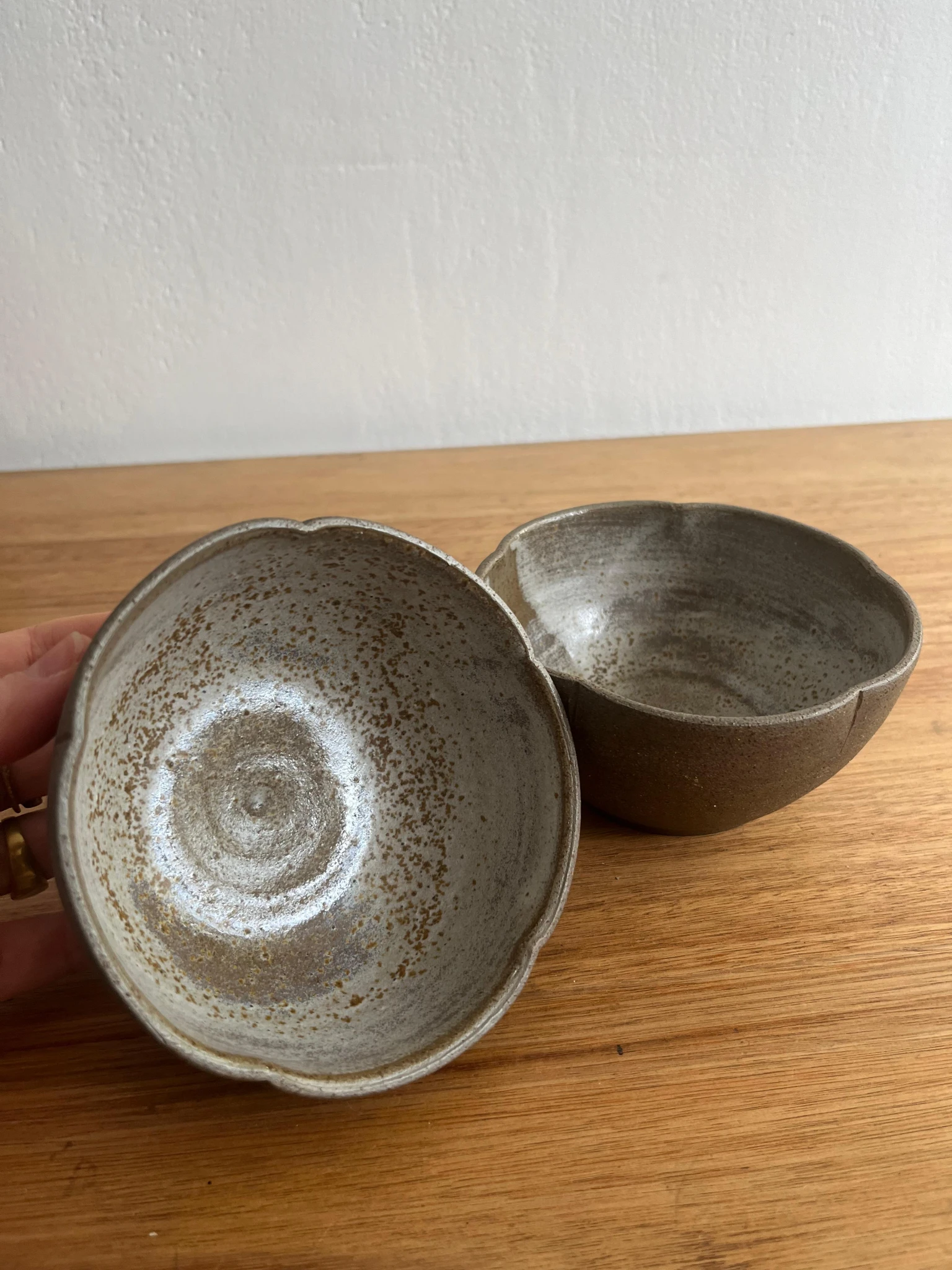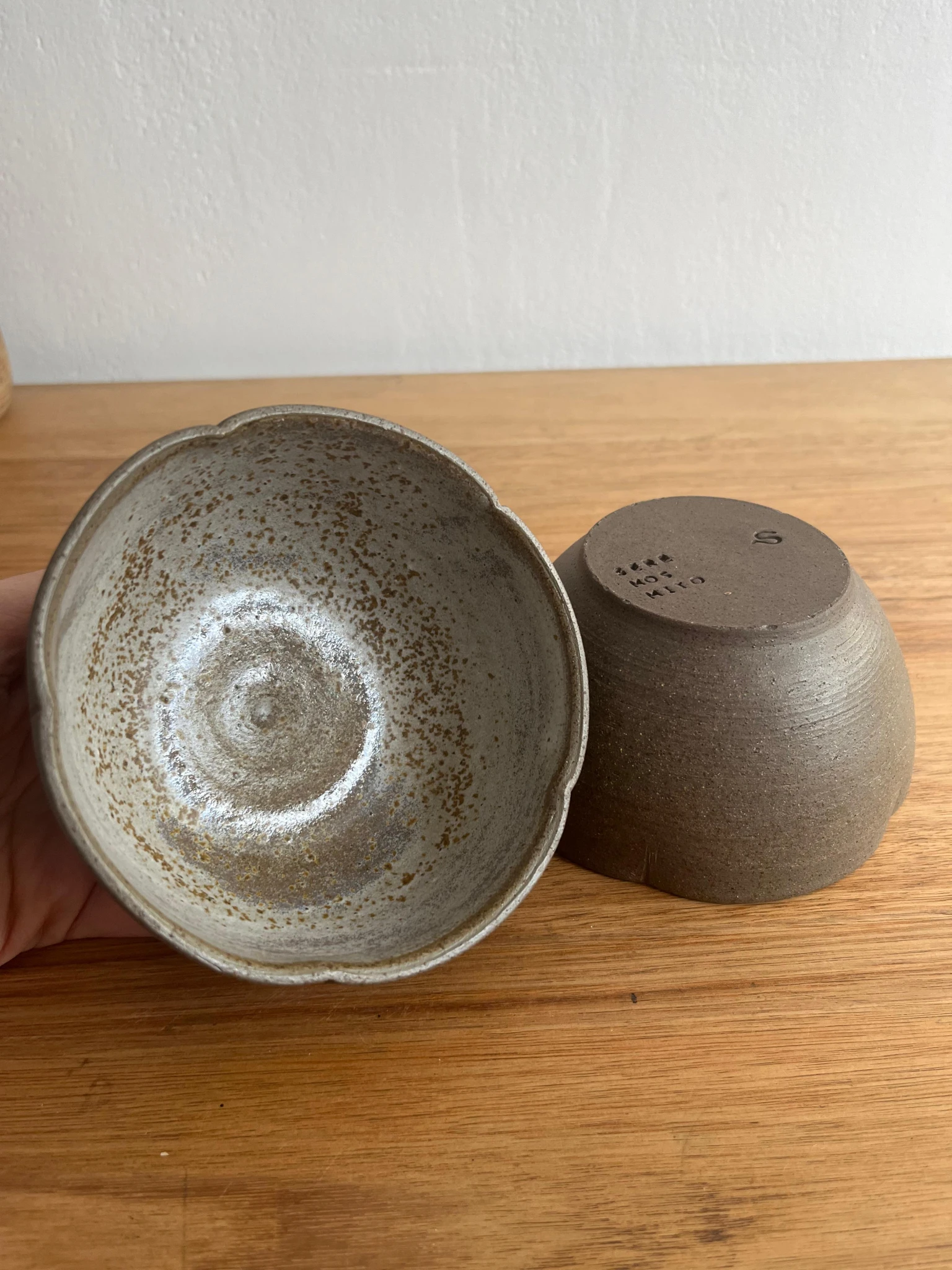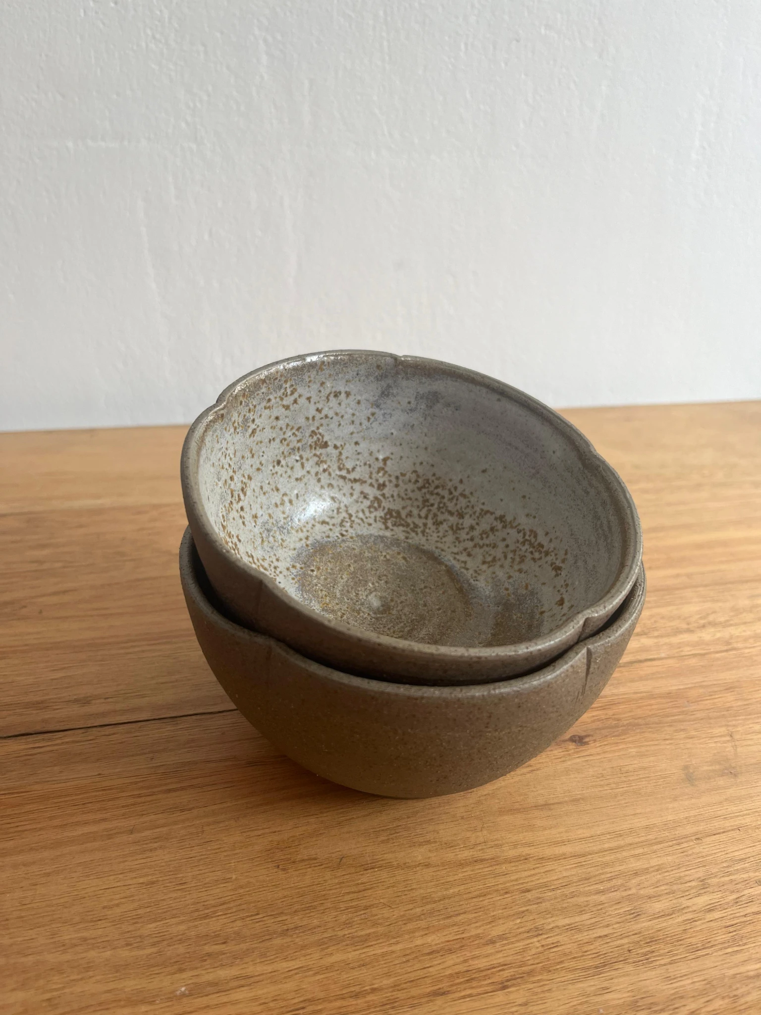 Estos cuencos están hechos con arcilla marrón oscura, fueron horneadas a +1200 grados, logrando una pieza de gres resistente. fueron hechas a mano en torno alfarero, con esmalte solo en su interior; el exterior revela las hermosas texturas y colores naturales del material. La boca de los cuencos está moldeada como una flor.