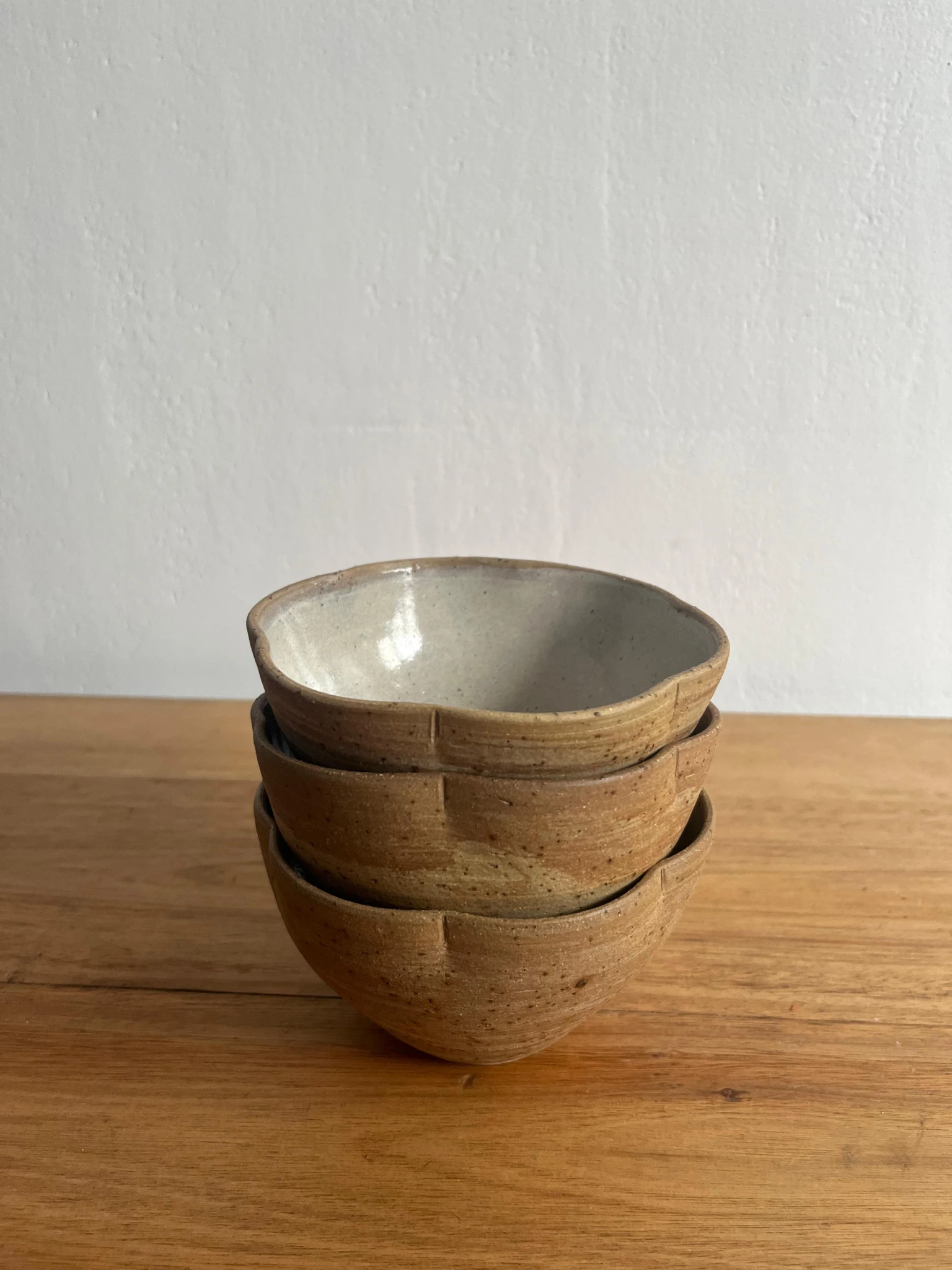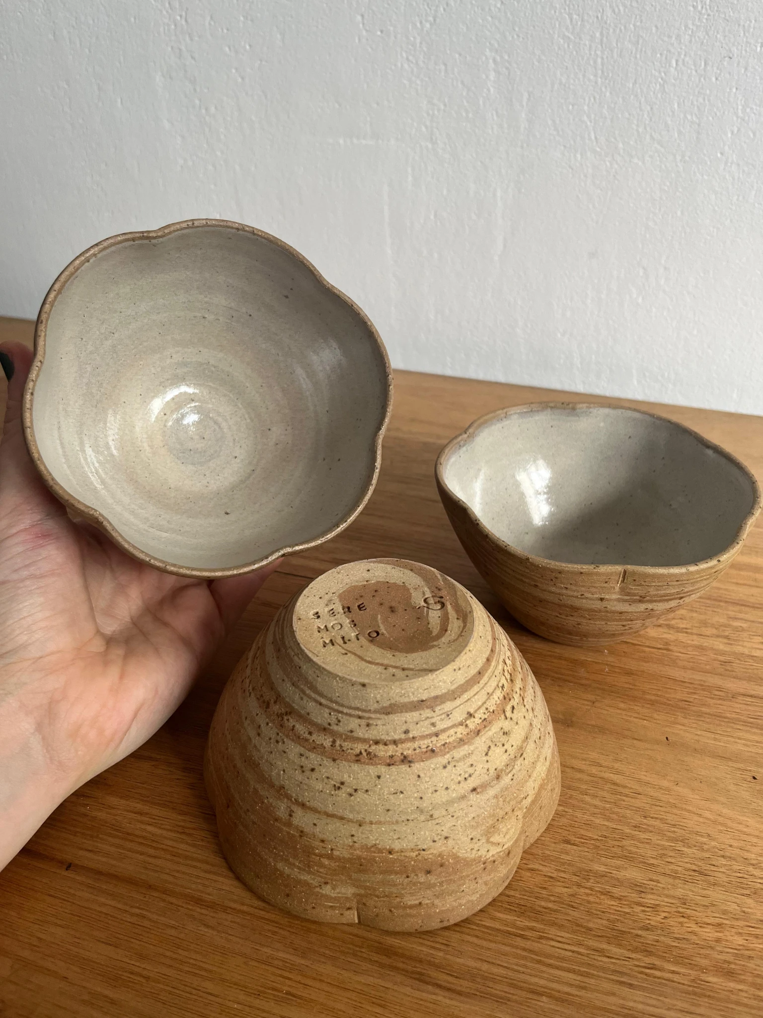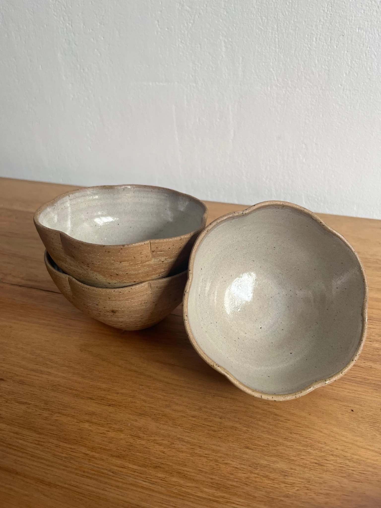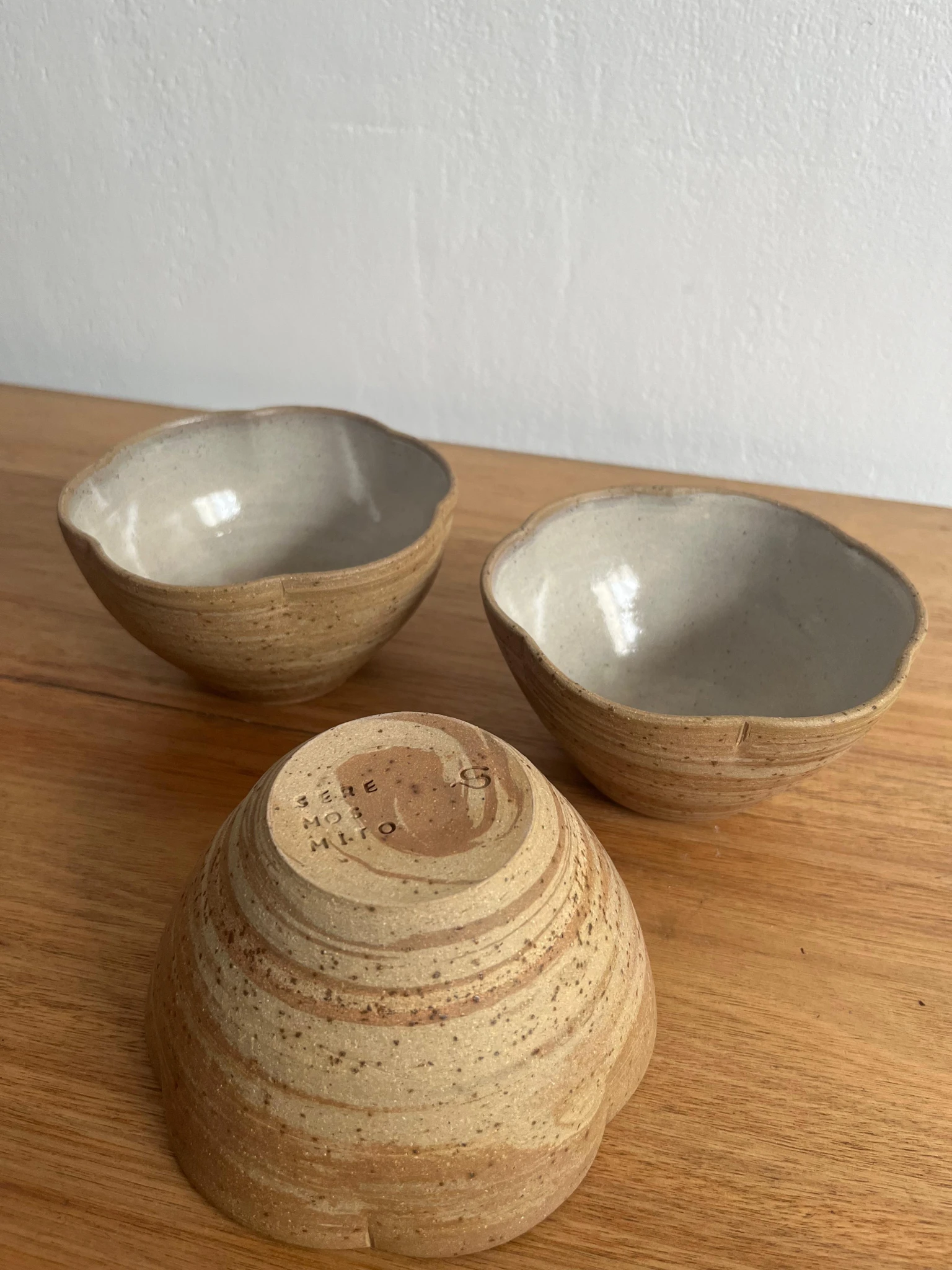 En estos cuencos se entrelazan dos tipos de arcillas diferentes, que fueron horneadas a +1200 grados, logrando una pieza de gres resistente. fueron hechas a mano en torno alfarero, con esmalte solo en su interior; el exterior revela las hermosas texturas y colores naturales del material. La boca de los cuencos está moldeada como una flor.
