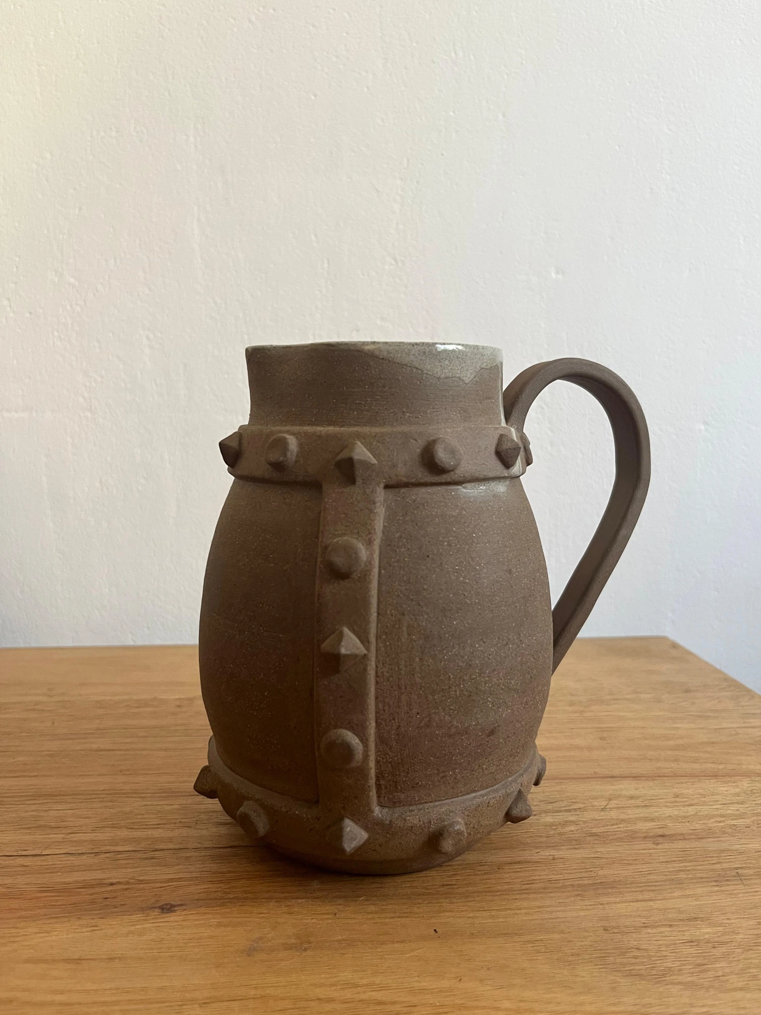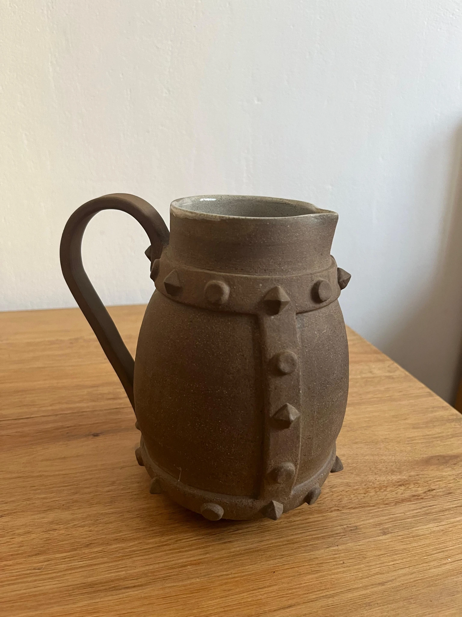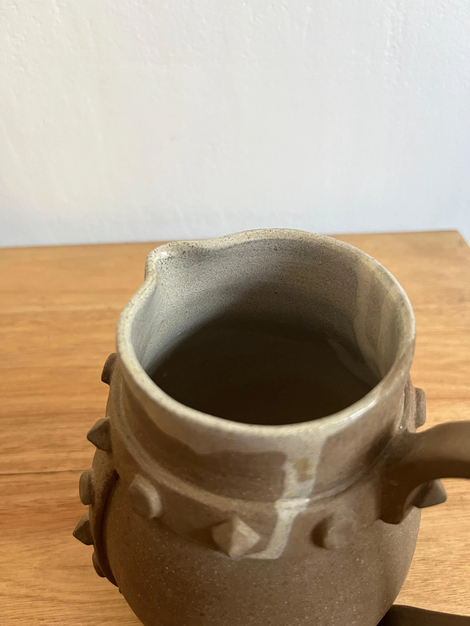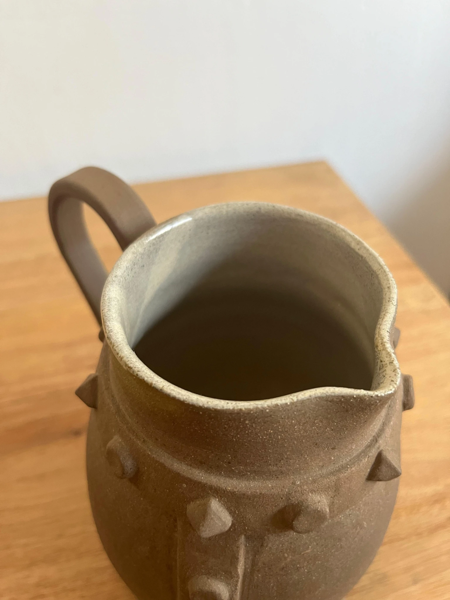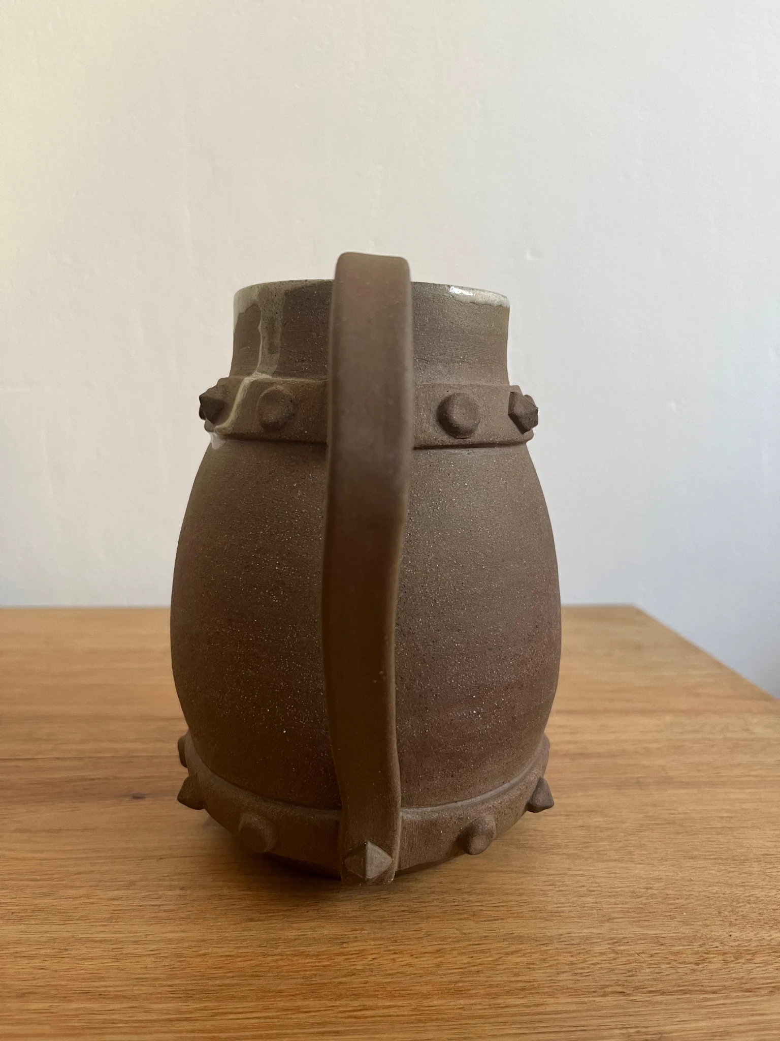 Esta jarra está hecha con arcilla marrón. Fue horneadas a +1200 grados, logrando una pieza de gres resistente. Está hecha a mano en torno alfarero, y luego cada detalle fue modelado a mano - Tiene esmalte solo en su interior; el exterior revela las hermosas texturas y colores naturales del material.
