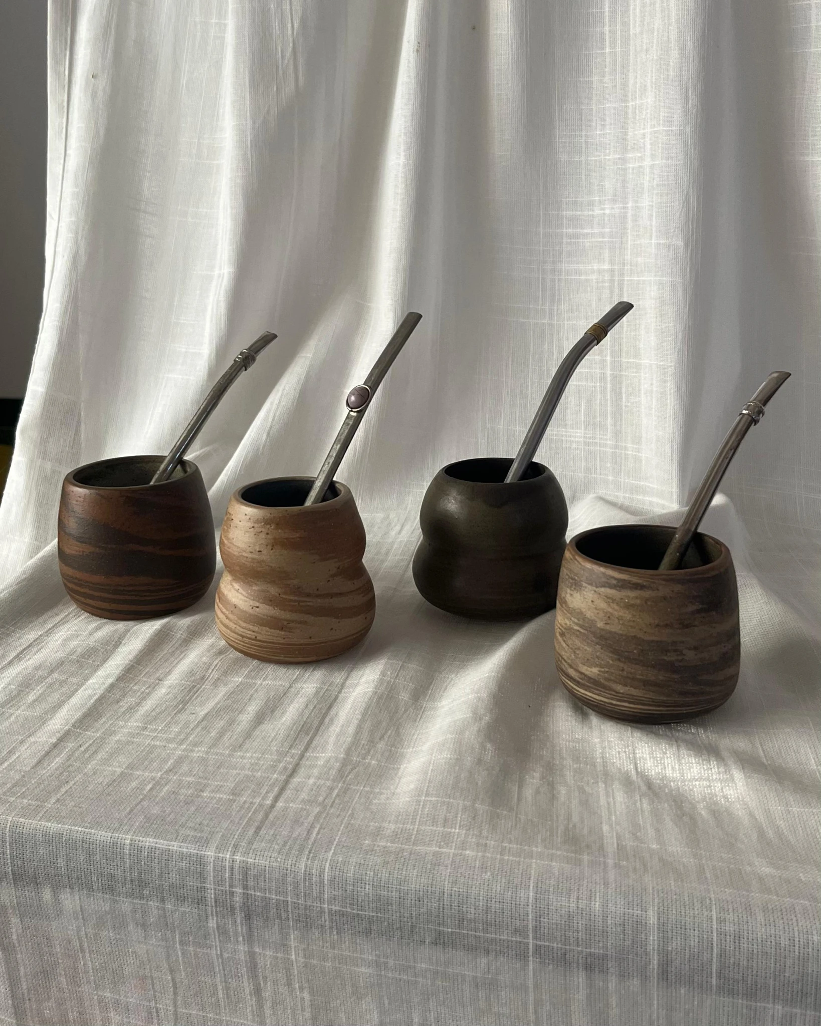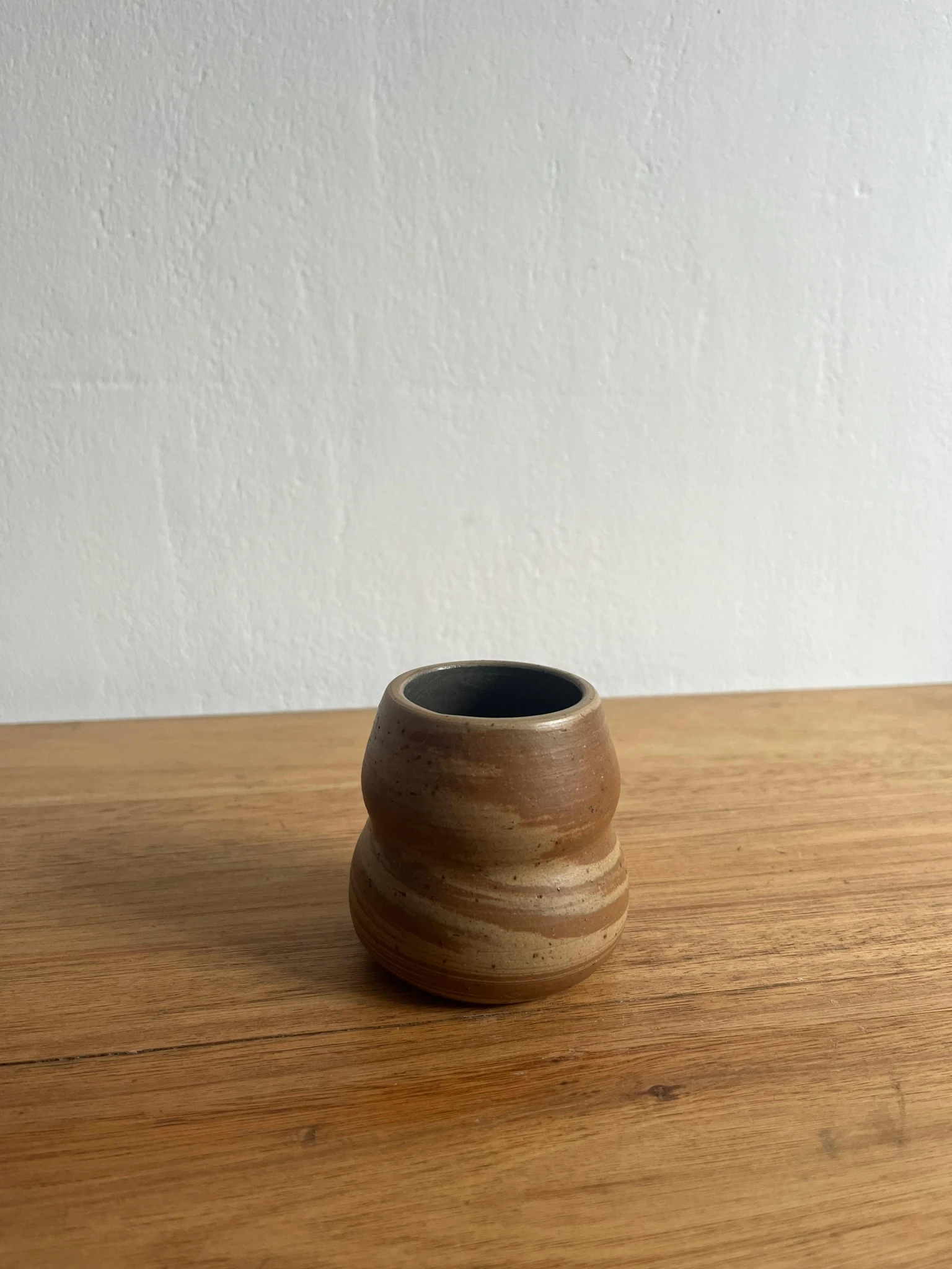 En este mate se entrelazan dos tipos de arcillas diferentes, que fueron horneadas a +1200 grados, logrando una pieza de gres resistente. fue hecho a mano en torno alfarero, con esmalte solo en su interior; el exterior revela las hermosas texturas y colores naturales del material.