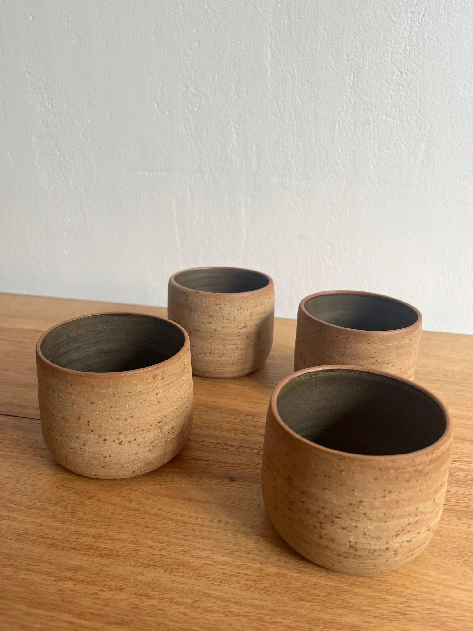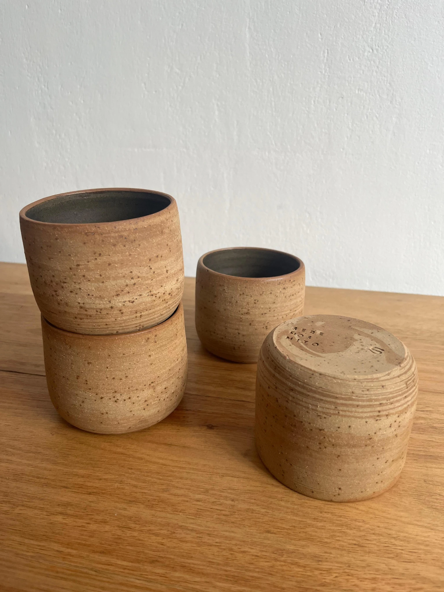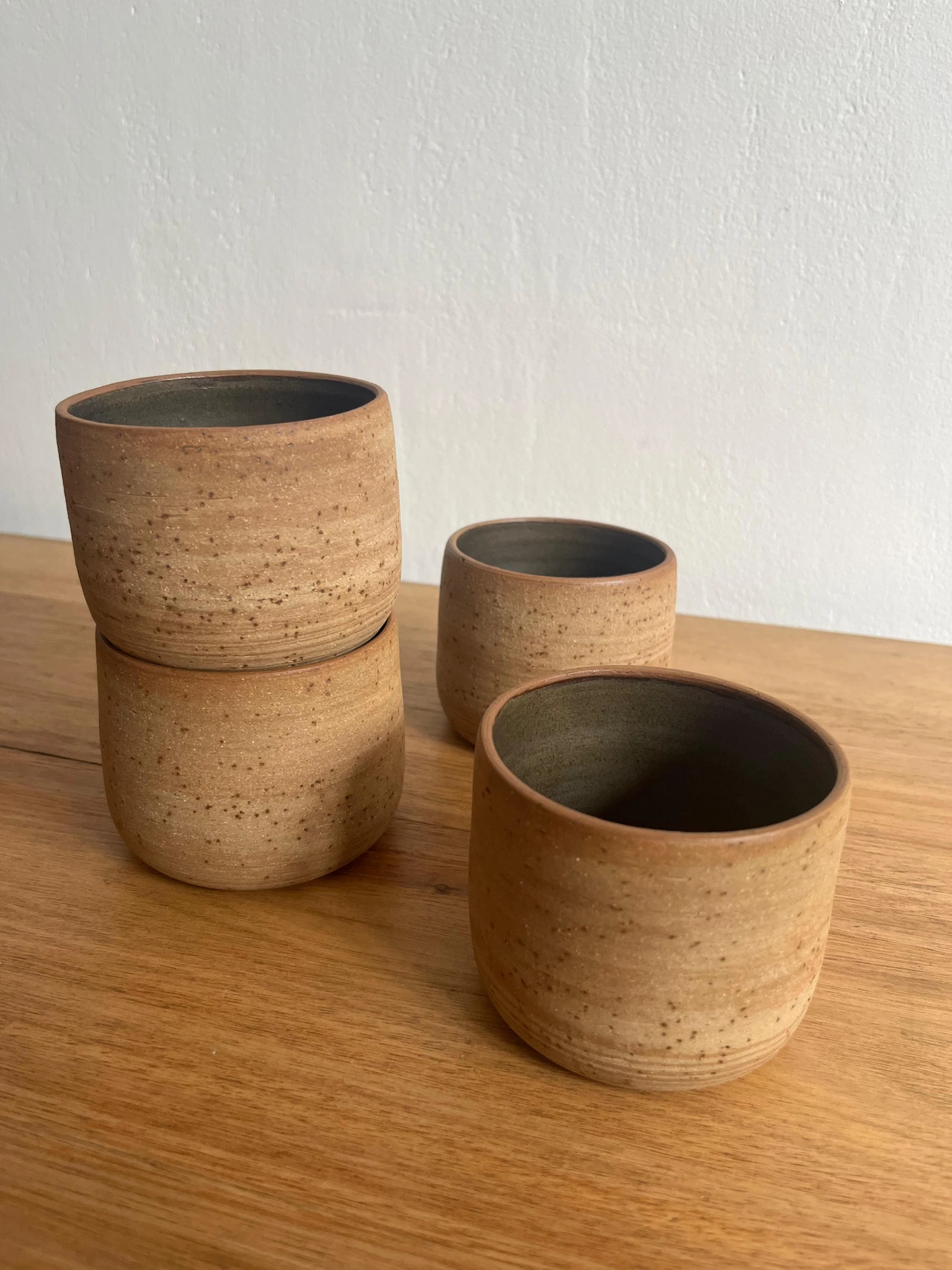 Estas tazas entrelazan dos tipos de arcillas diferentes, que fueron horneadas a +1200 grados, logrando una pieza de gres resistente. fueron hechas a mano en torno alfarero, con esmalte solo en su interior; el exterior revela las hermosas texturas y colores naturales del material. La boca de estas tazas tienen una terminación más bien oval y orgánica - no son circulares.