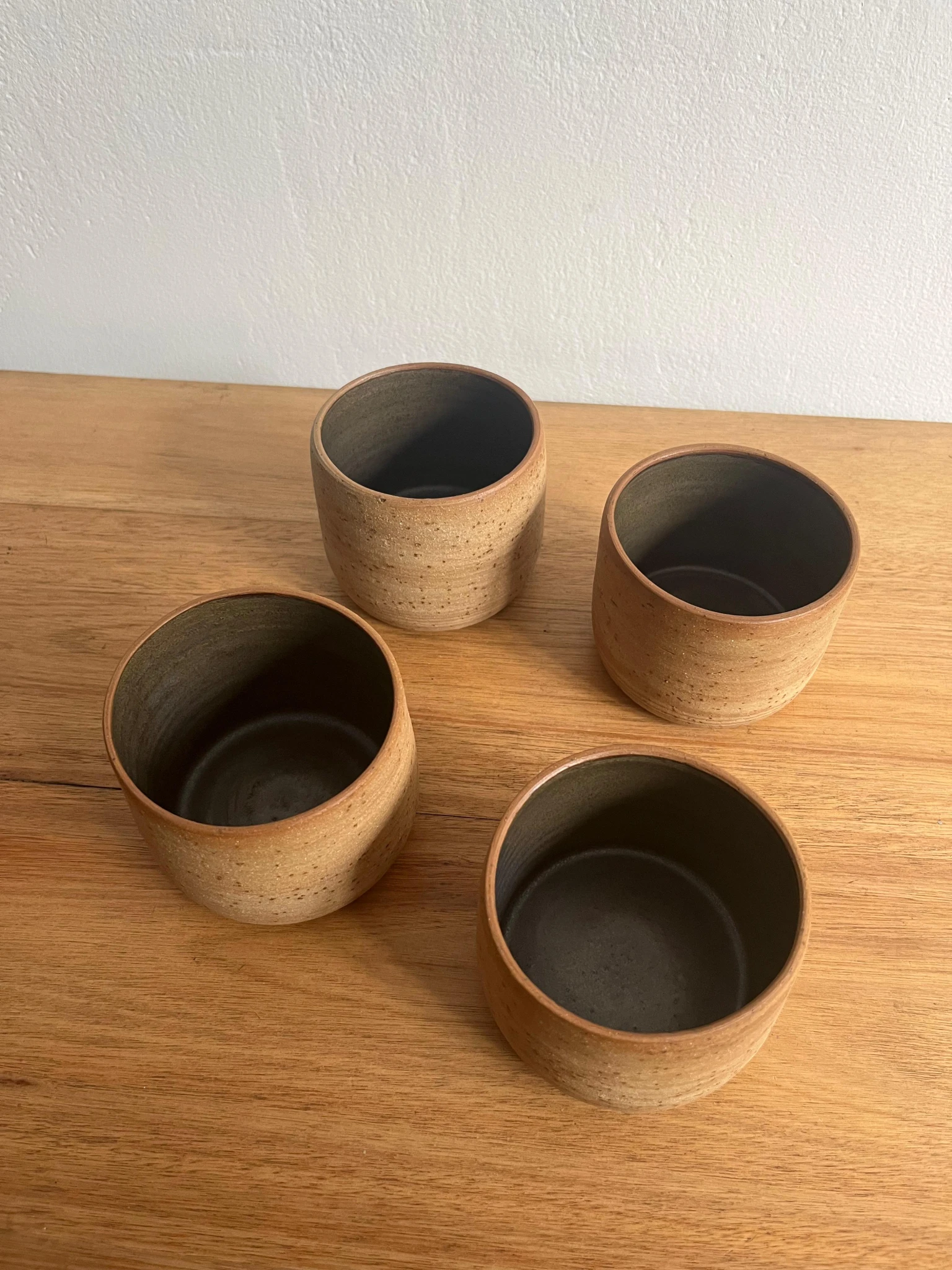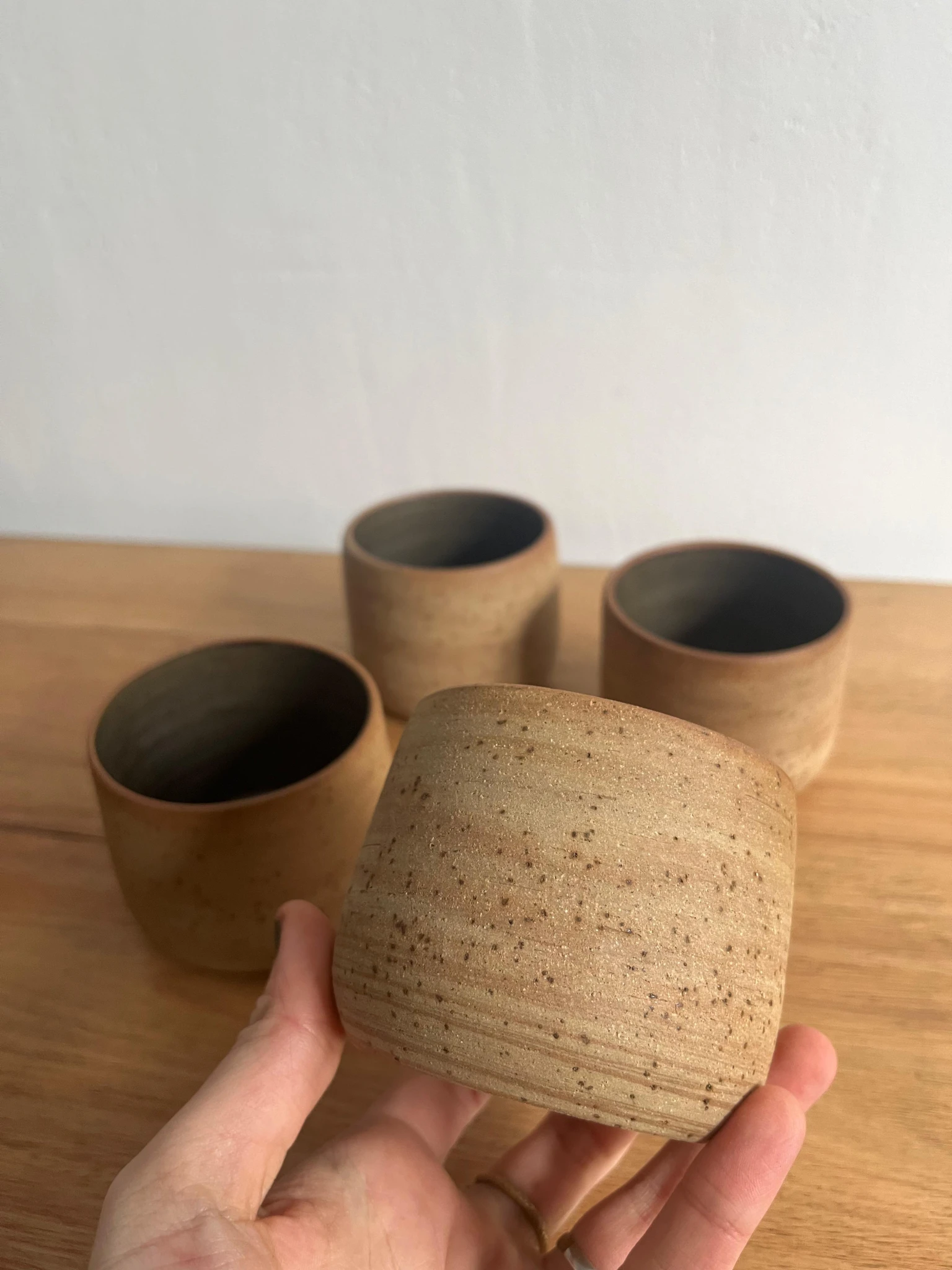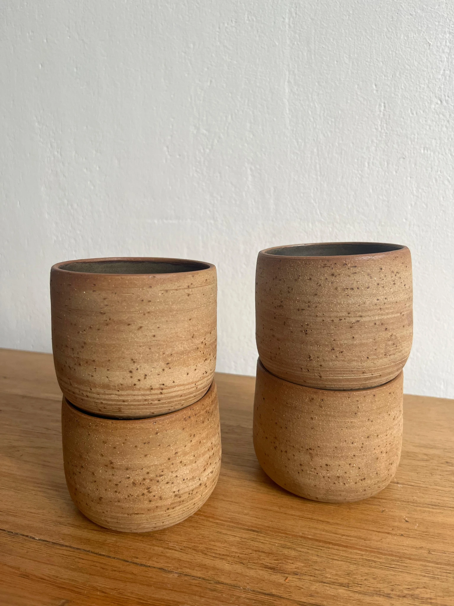 Estas tazas entrelazan dos tipos de arcillas diferentes, que fueron horneadas a +1200 grados, logrando una pieza de gres resistente. fueron hechas a mano en torno alfarero, con esmalte solo en su interior; el exterior revela las hermosas texturas y colores naturales del material. La boca de estas tazas tienen una terminación más bien oval y orgánica - no son circulares.