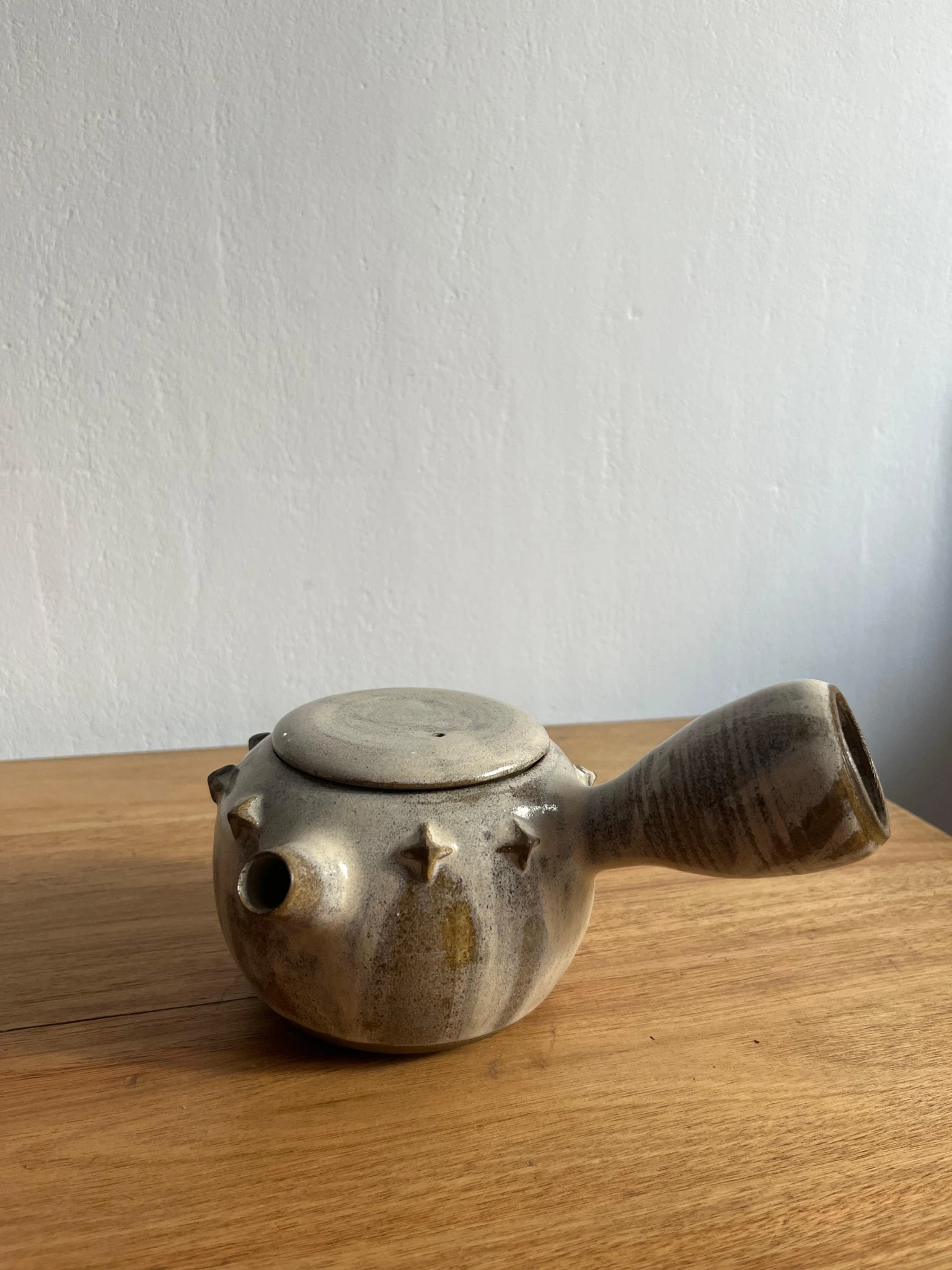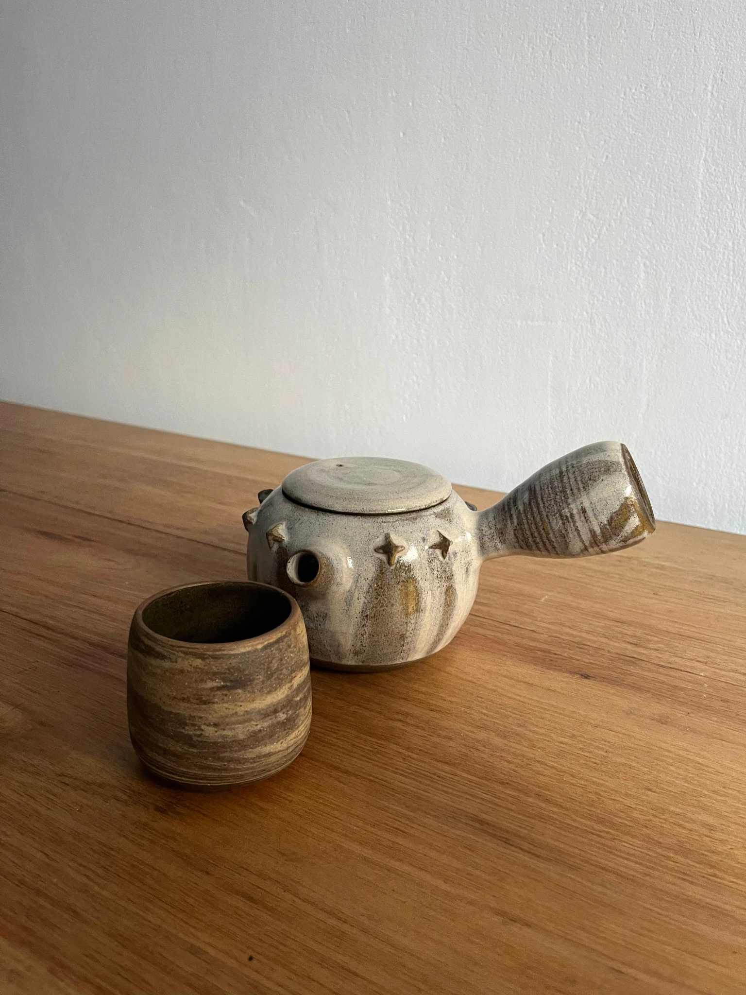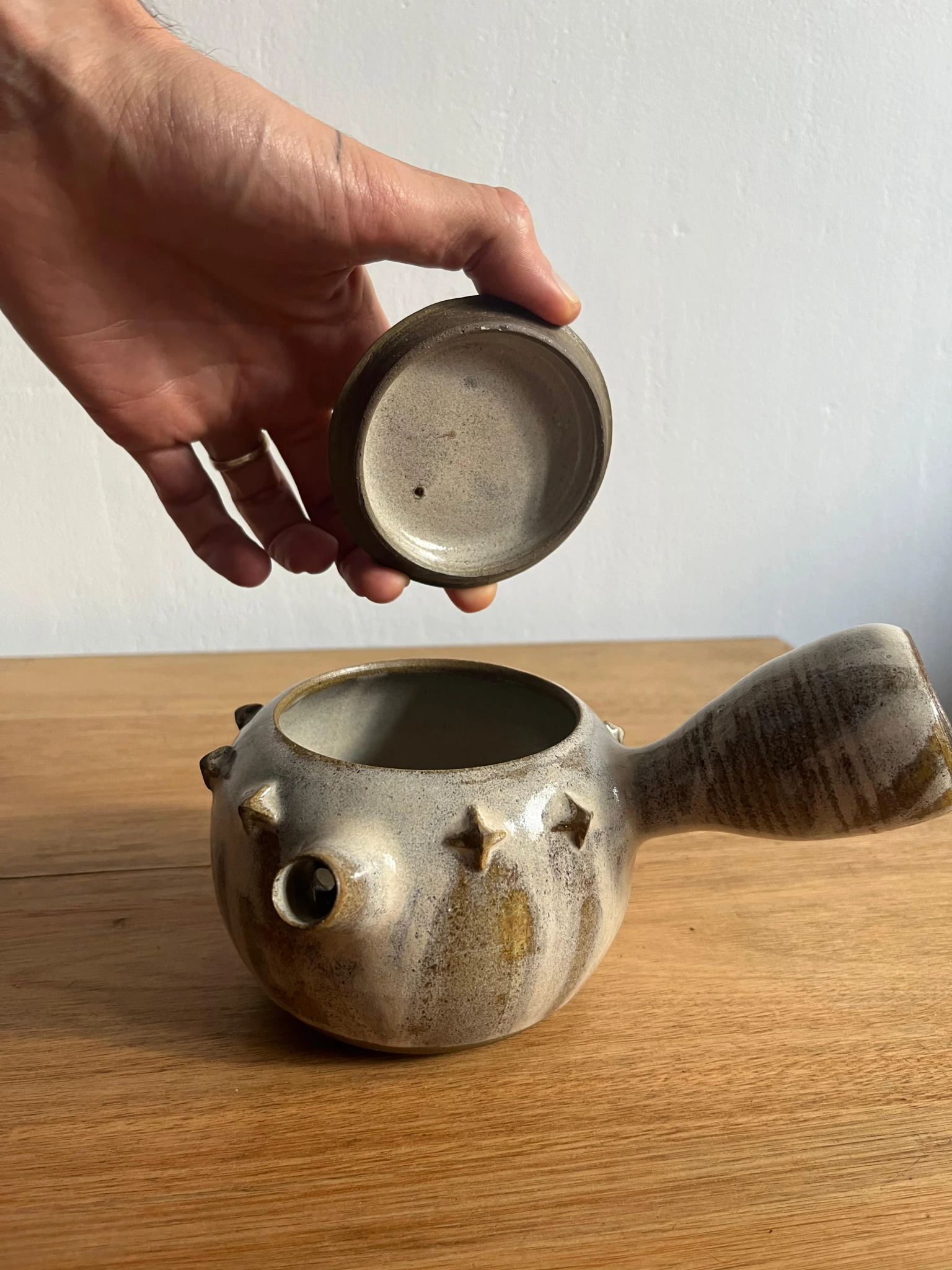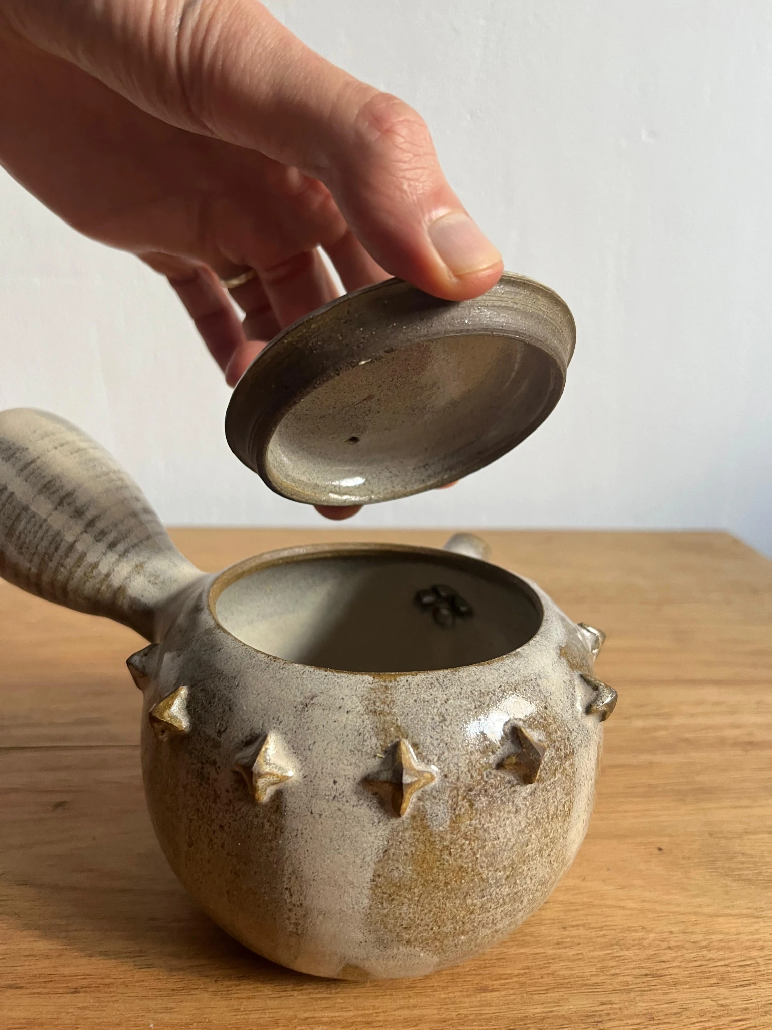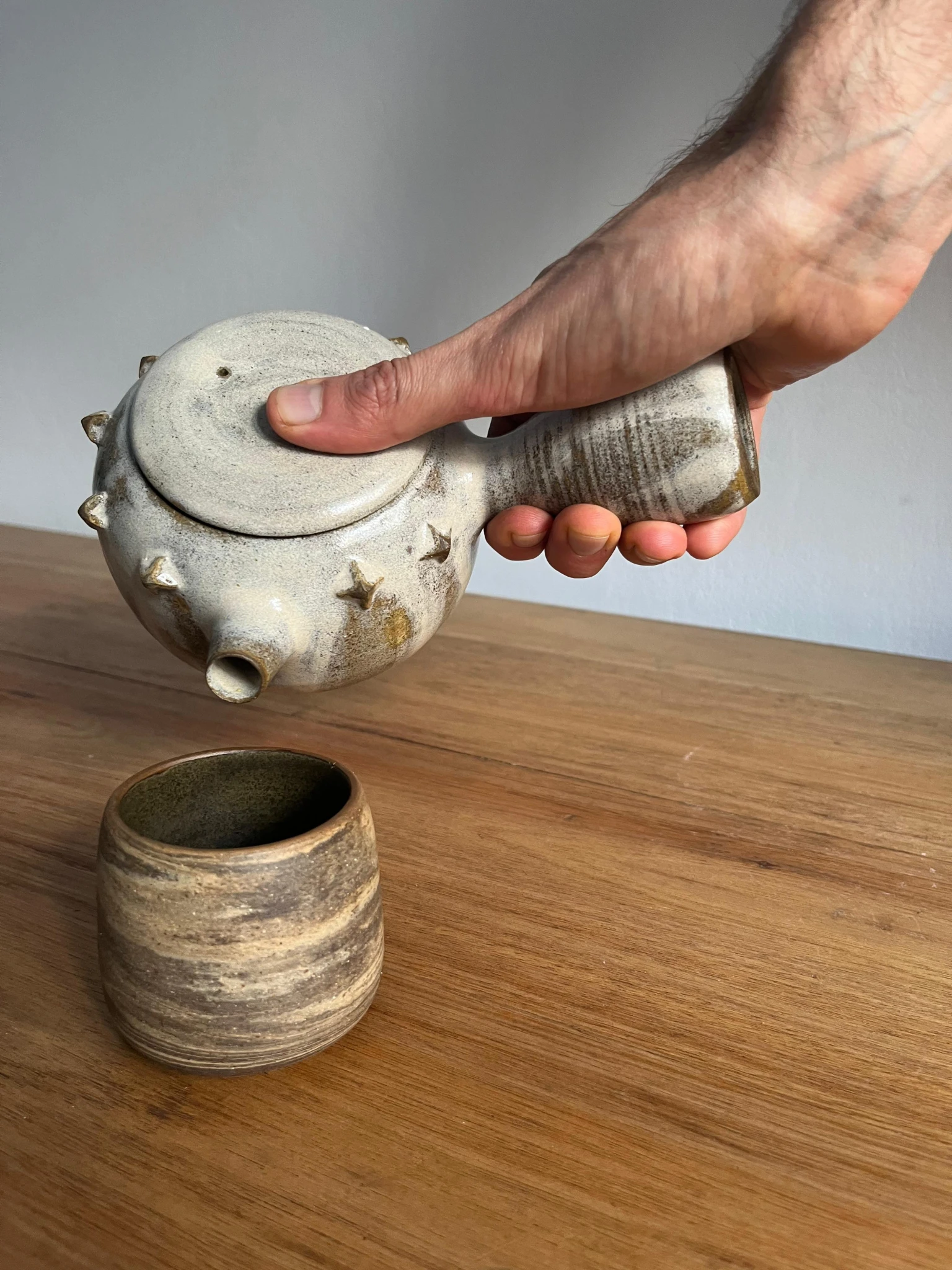 Esta tetera está hecha con arcilla marrón oscura. Fue horneada a +1200 grados, logrando una pieza de gres resistente. Está hecha a mano en torno alfarero, y luego cada pieza fue unida a mano, modelando los detalles - Tiene esmalte en su interior y exterior.